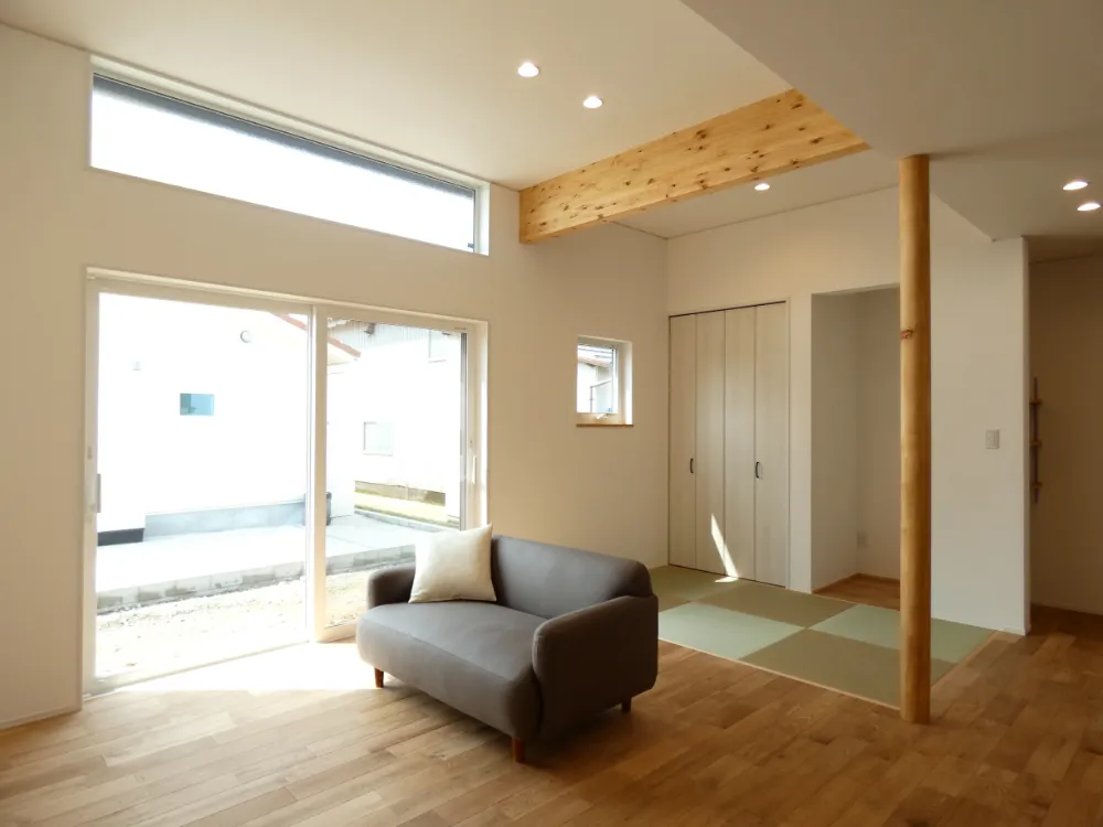 夏はサラッと冬は暖かい無垢床や、空間のアクセントとなる化粧梁や丸柱など お気に入りの木に囲まれた、心地よい住まい。 LDKは開放感のある高天井とし、天井の高さに合わせて設けたFIX窓からは あたたかで気持ちの良い光が降り注ぎます。 また、空気を浄化する塗り壁や、調湿効果のある羊毛断熱材からも 自然素材の温もりが感じられ、居心地の良さを創り出しています。 玄関からパントリー・キッチンへとつながる動線で 買い物帰りの荷物運びもスムーズ。 1階にはご主人の趣味部屋を設け、友人や仲間と過ごす楽しい時間を。 トイレと洗面は帰宅動線上に配置し、手洗い動線もスムーズに。 さらに「洗面~ファミリークローゼット~ランドリー~脱衣室~LDK」を つなぐ回遊動線で、毎日の家事負担を軽減。 忙しい共働き夫婦の、効率的な暮らしを叶えます。