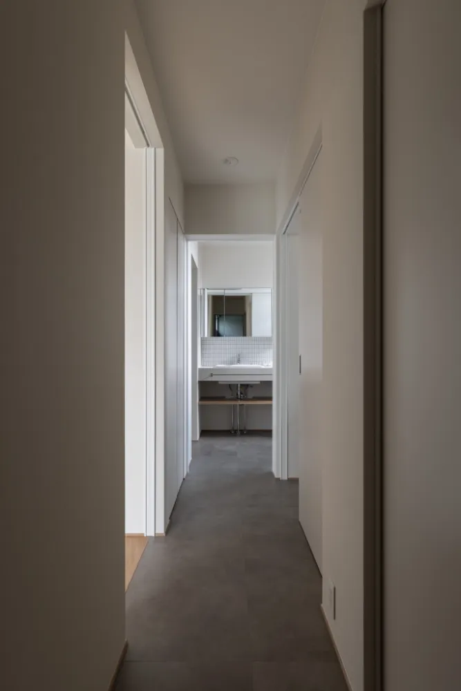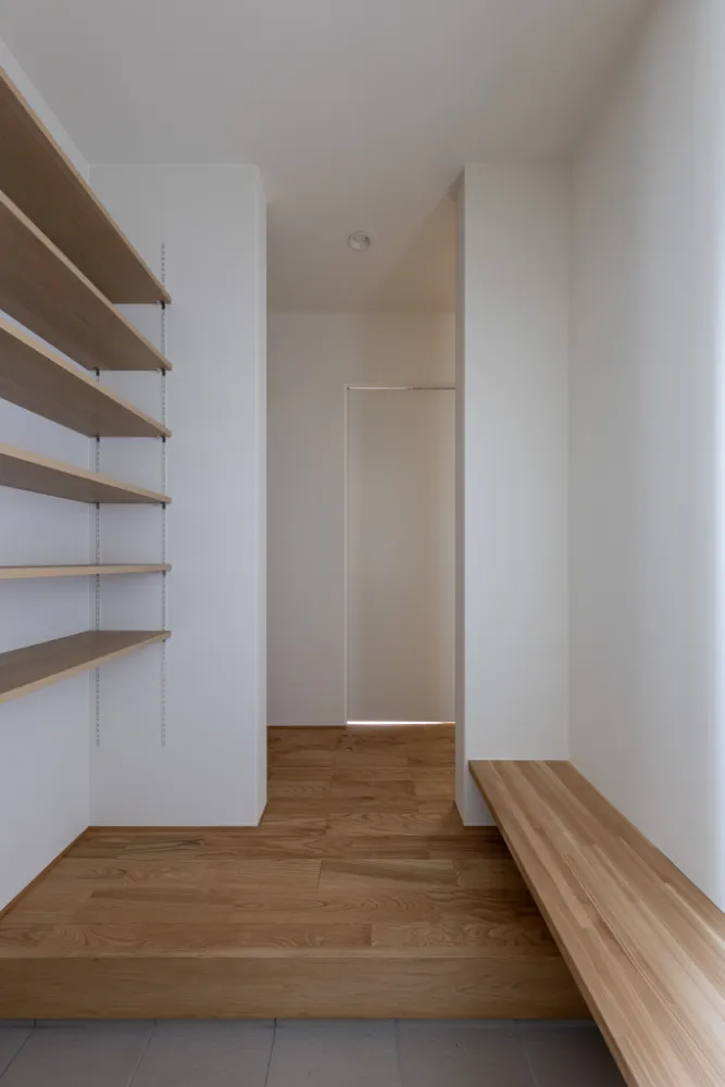 玄関からシューズクロークへ。 荷物を置いたり、腰かけたりできるベンチを設えました。 その奥はファミリークロークへとつながっています。