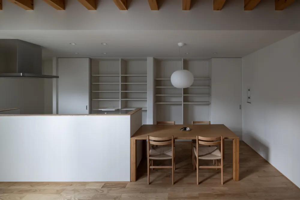 配膳が容易な横づけのダイニング。 背面には大容量のパントリーを設け、来客時は生活感が出ないような工夫を。