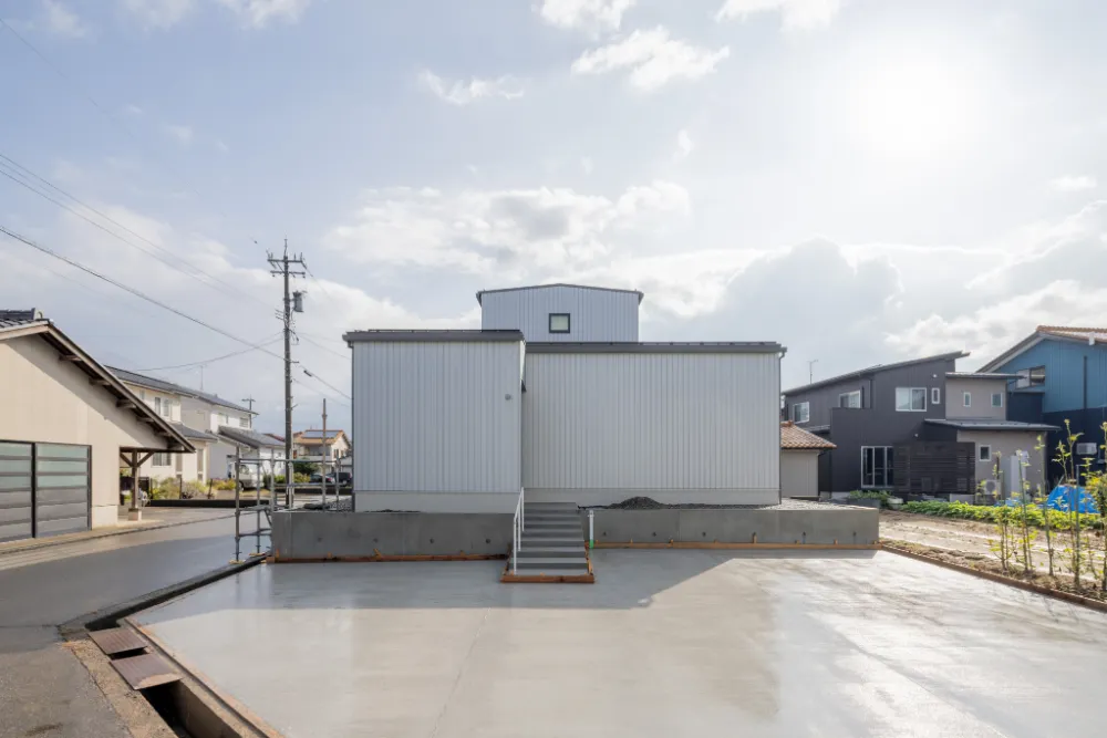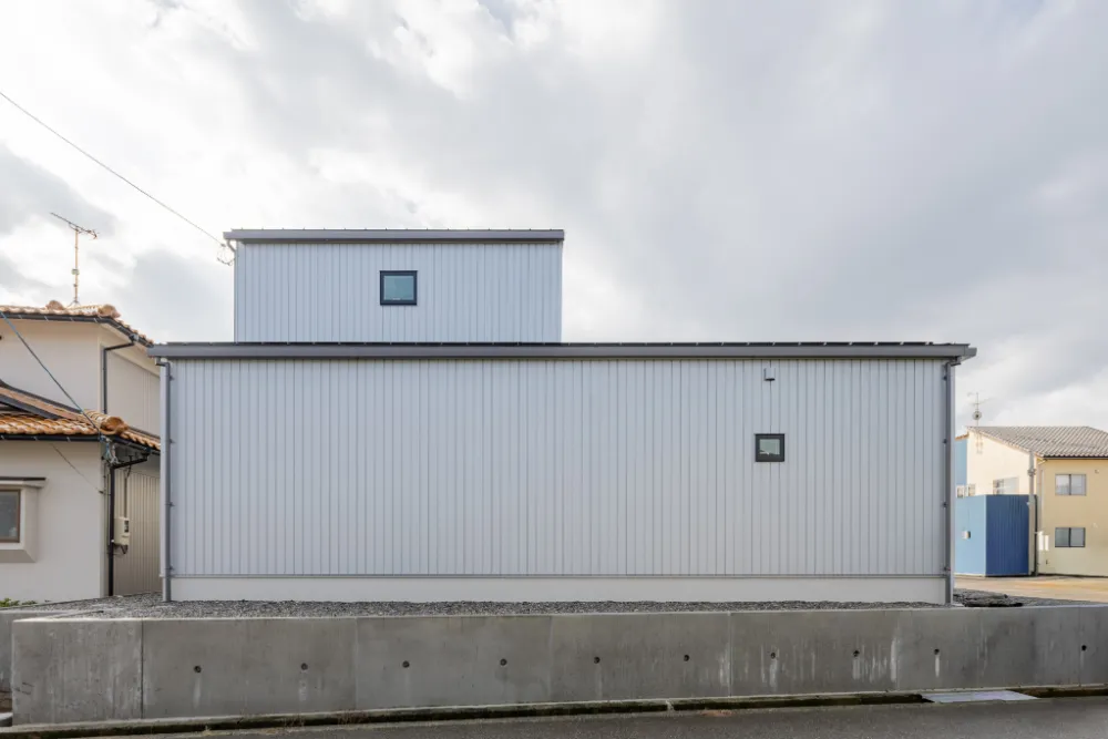 角地に位置するため、横からの見え方にも配慮した。 マットシルバーのガルバリウム鋼板で仕上げてたシンプルな外観。