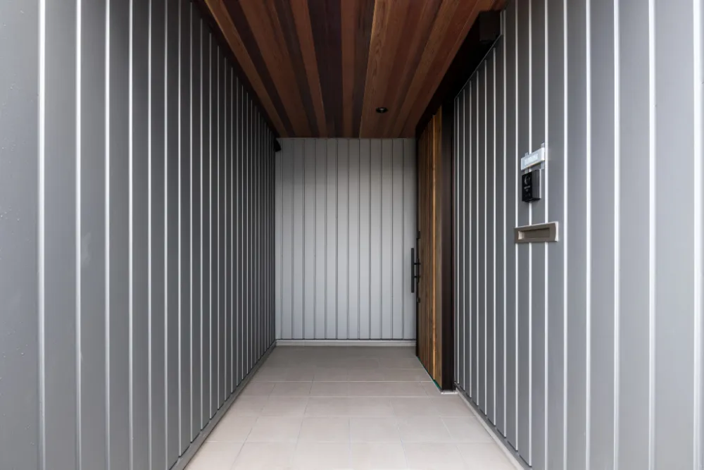 玄関ポーチの天井は木の羽目板を設え、玄関ドアとの調和を図った。