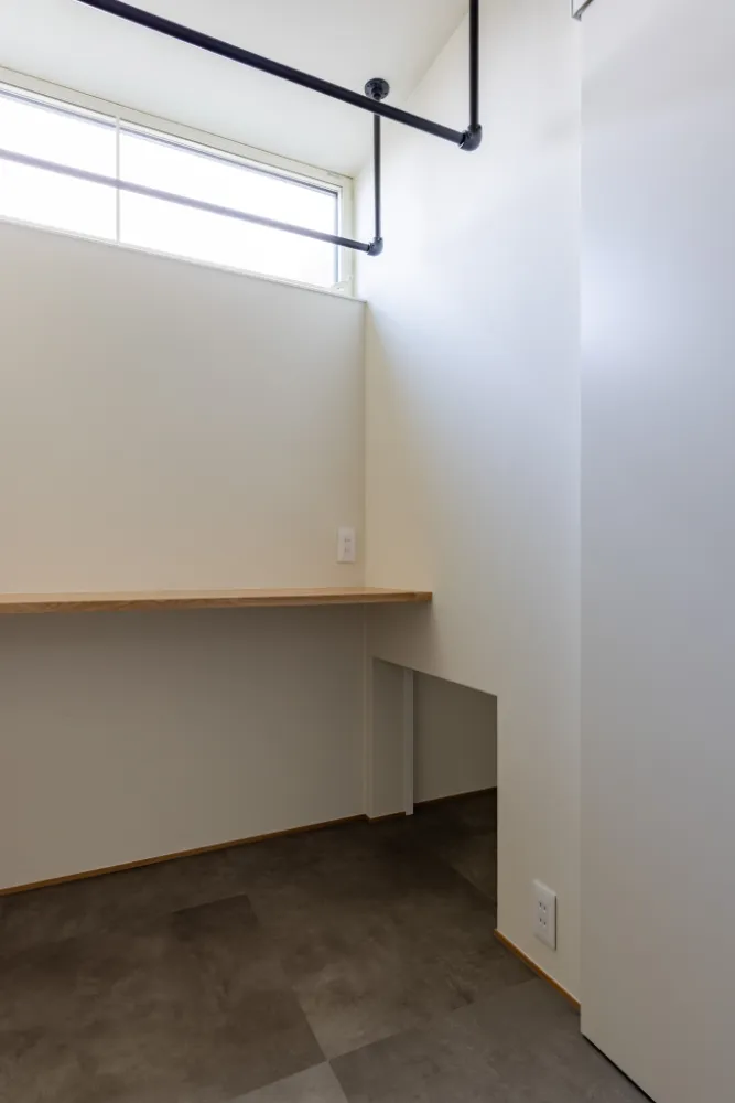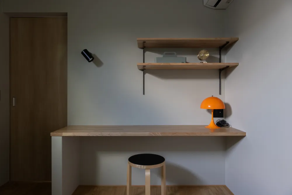 寝室の一角にデスクスペースを作りました。 色のトーンを落とした落ち着きのある内装に仕上げています。