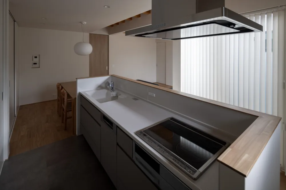 アイランドキッチンで回遊できるのも魅力のひとつ。 中庭で遊ぶお子様の様子をキッチンから見守れます。