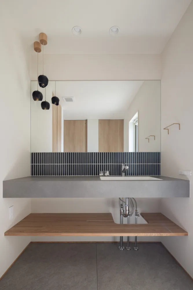 洗面はシンプルに、タイルと一面鏡を設えました。 奥様こだわりの照明が良いアクセントになっています。