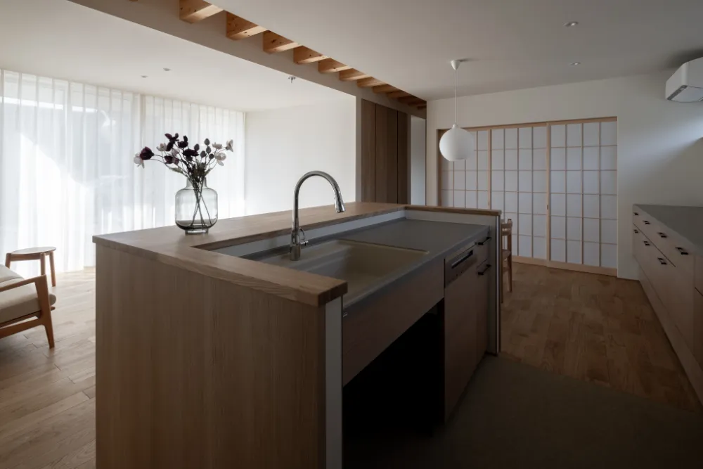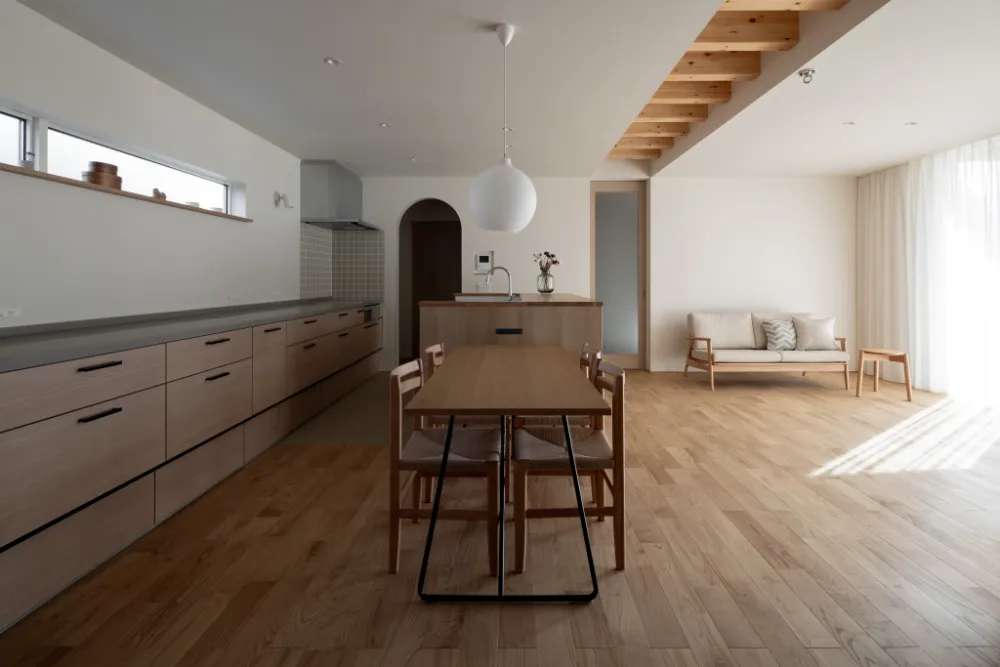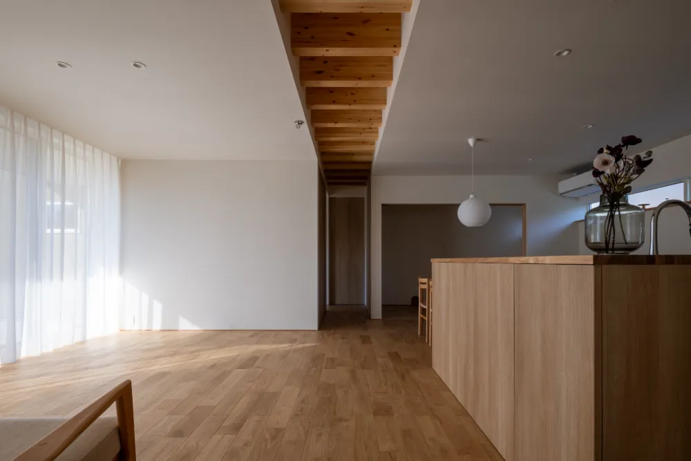 奥行感を強調させるスリット天井。 日中は南からの日差しが心地よく、照明要らずです。