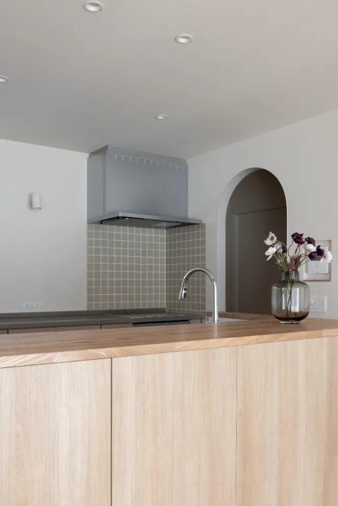 キッチンのオイルガードはタイルを採用。 マットな質感と絶妙な色合いが空間と調和し、程よく差し色になっています。