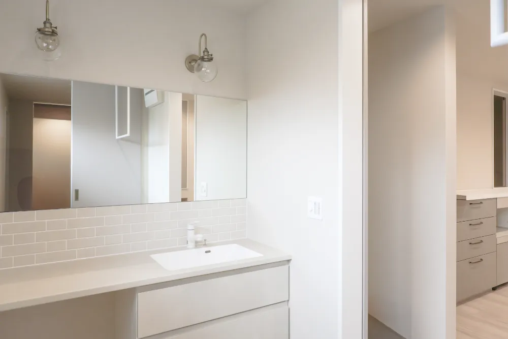 玄関→洗面→脱衣→ユーティリティへと続く回遊動線は、子育て世帯のストレスをそっと軽くしてくれるつくり。 造作風洗面台は、タイルと一面鏡、丸いライトの組み合わせが"可愛さ×上品さ”のバランスを絶妙に保っています。 水廻りを独立させたことで、朝の支度時間もゆったり。 暮らしてから感じる快適さは抜群です。