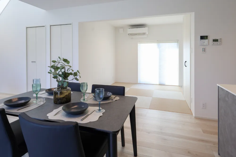 室内は白×グレー×黒のやさしいモノトーン。 可愛さを引き立てつつも、くどくならない色使いで、どこに視線を向けても落ち着いたトーンで整います。 LDKの奥にはひらけた庭が広がり、子どもが外で遊ぶ姿を見守ったり、家族でBBQを楽しんだり… "風景までインテリアの一部”になるような設計です。