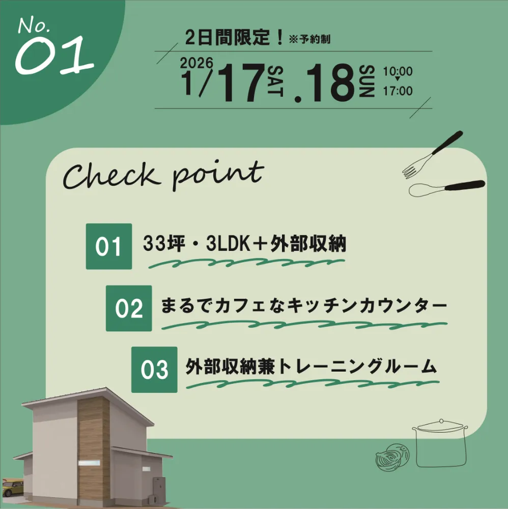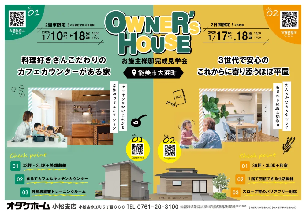 1月17日・18日は、同じく「能美市大浜町」にて、もう1棟お施主様邸の見学ができます! 完全自由設計で1棟1棟がオリジナルの家を、イッキに見比べできちゃう、この機会にぜひ♪