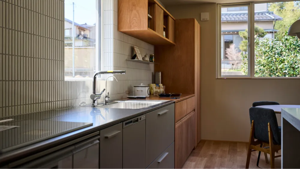 料理が捗るセパレート型の「2型キッチン」と、洗濯革命を起こす「乾太くん」を搭載。回遊動線との組み合わせで、日々の負担を最小限に抑えます。